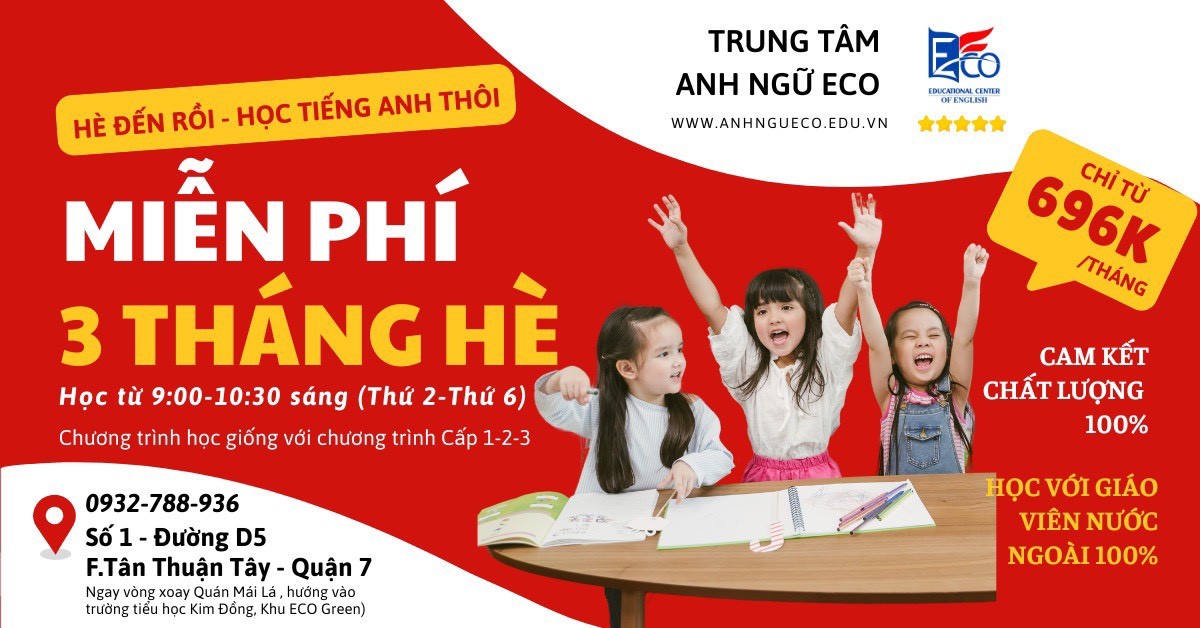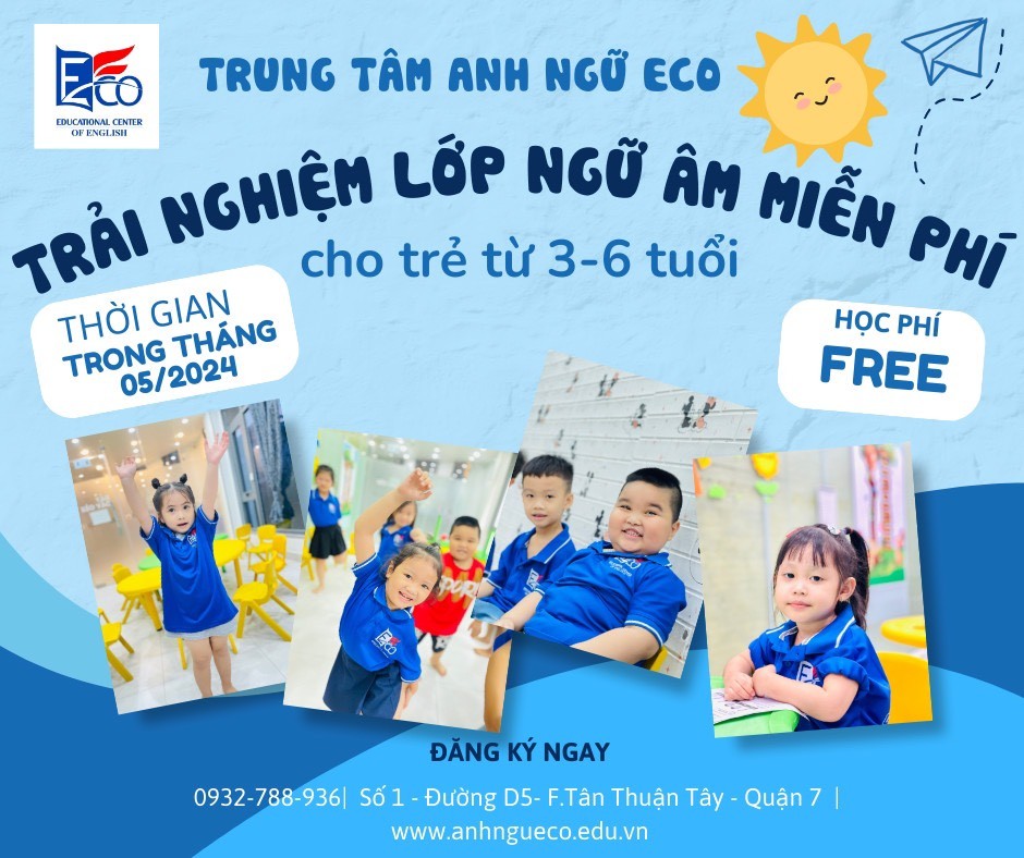Chương trình Tiếng Anh dành cho thiếu nhi là một chương trình học Tiếng Anh đáng tin cậy và mang lại những lợi ích lâu dài cho sự phát triển của các em. Trung Tâm Anh Ngữ ECO cam kết tiếp tục nỗ lực để duy trì và nâng cao chất lượng giảng dạy, nhằm mang lại những thành công và tiến bộ cho tất cả các học viên của trung tâm.
