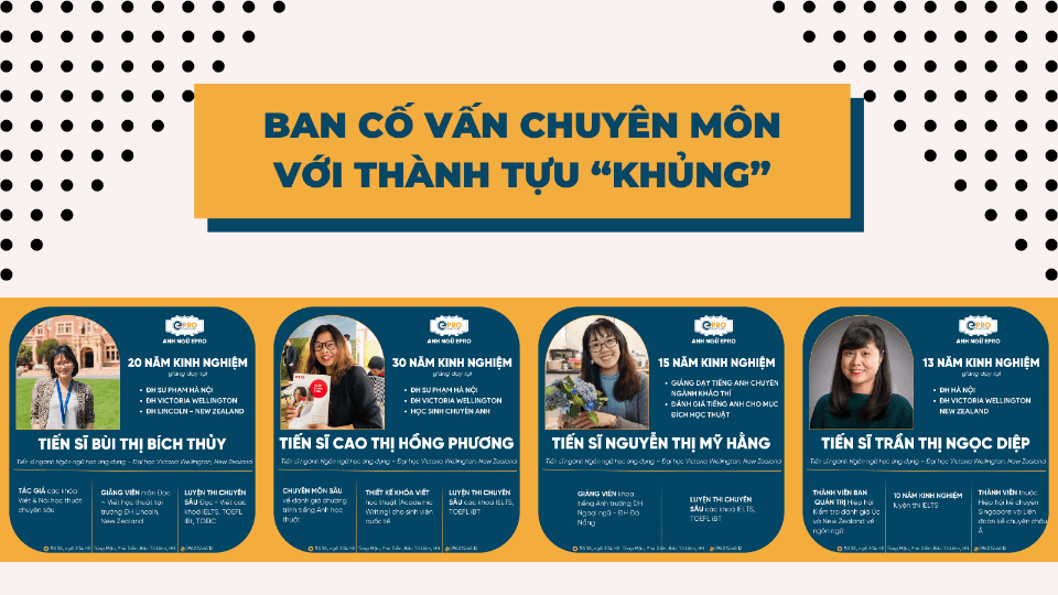 - Các giảng viên đứng lớp tại EPRO là những Tiến sĩ, Thạc sĩ tốt nghiệp chuyên ngành ngôn ngữ Anh từ nhiều trường Đại Học Top đầu trong và ngoài nước được đào tạo bài bản, có trình độ chuyên môn cao, có bề dày kinh nghiệm nhiều năm trong lĩnh vực giảng dạy và luyện thi IELTS từ nhiều môi trường khác nhau giúp học viên tiếp cận kiến thức một cách rõ ràng và hiệu quả.