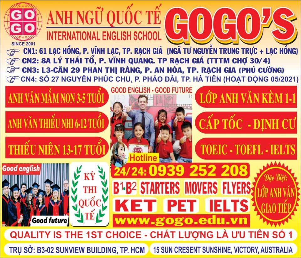 Tiêu chí hàng đầu tại GOGO là giúp học viên luôn tự tin giao tiếp tiếng Anh trong cuộc sống,công việc và đạt điểm cao tại các kỳ thi quốc tế. Đặc biệt là kỳ thi cấp chứng chỉ của đại học Cambridge. Tất cả giáo viên nước ngoài và Việt Nam tham gia giảng dạy tại trung tâm đều là những giáo viên có kinh nghiệm, có bằng cấp và yêu quý học viên. Cùng với những trang thiết bị hiện đại hỗ trợ cho việc giảng dạy điều được trung tâm đầu tư kỹ lưỡng, tỉ mỉ từng chi tiết nhỏ, giúp cho các học viên tại đây sẽ thật sự thoải mái, hài lòng và đạt kết quả tốt trong học tập.