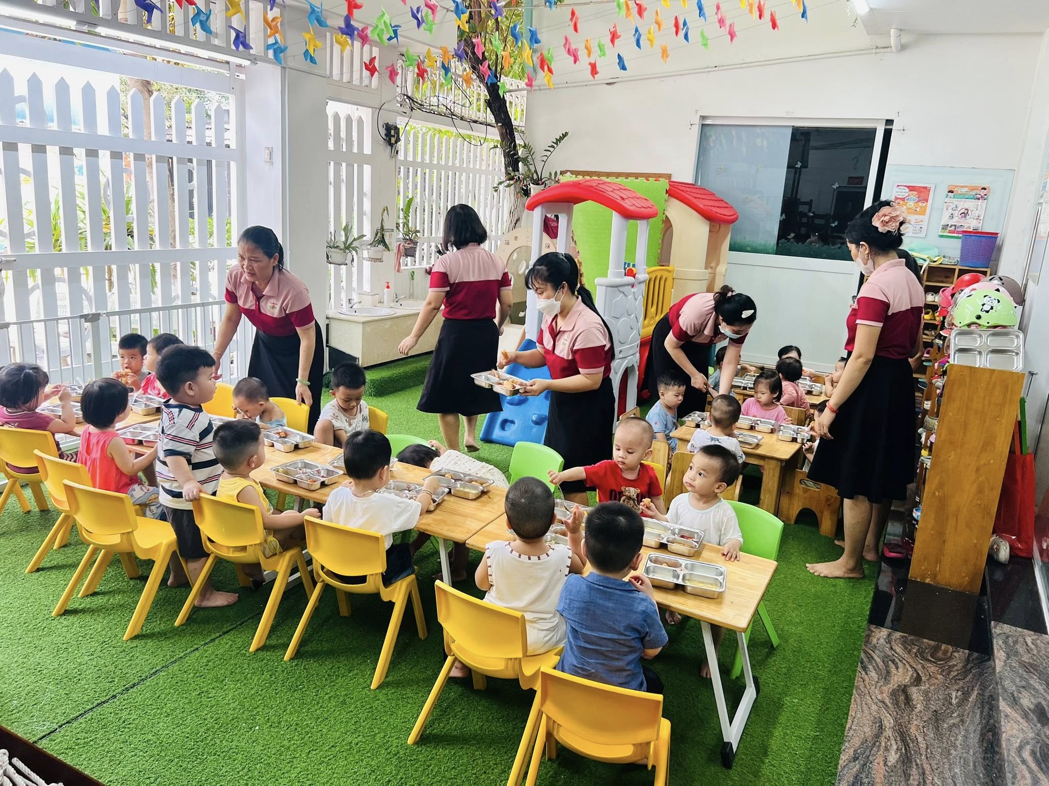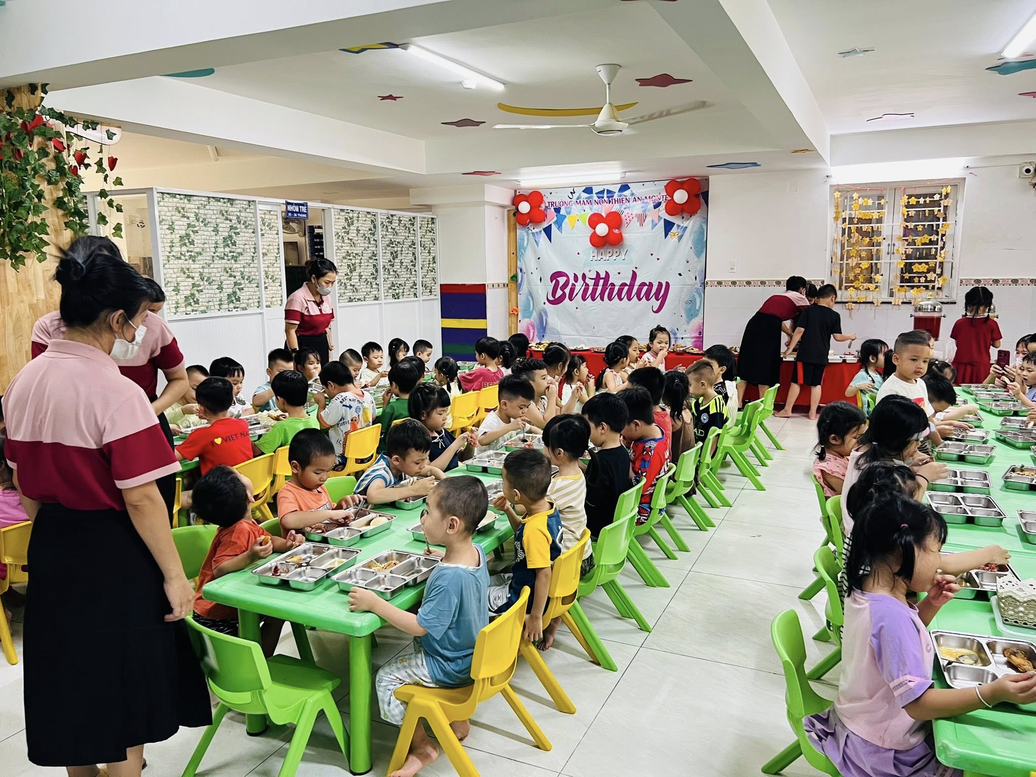 Trẻ được chăm sóc với 3 bữa chính (sáng, trưa, xế) và 2 bữa phụ mỗi ngày. Thực phẩm nhập từ các công ty uy tín, chế biến tại bếp ăn một chiều, đảm bảo vệ sinh an toàn thực phẩm. Thực đơn thay đổi hằng ngày, đa dạng và cân đối dinh dưỡng.