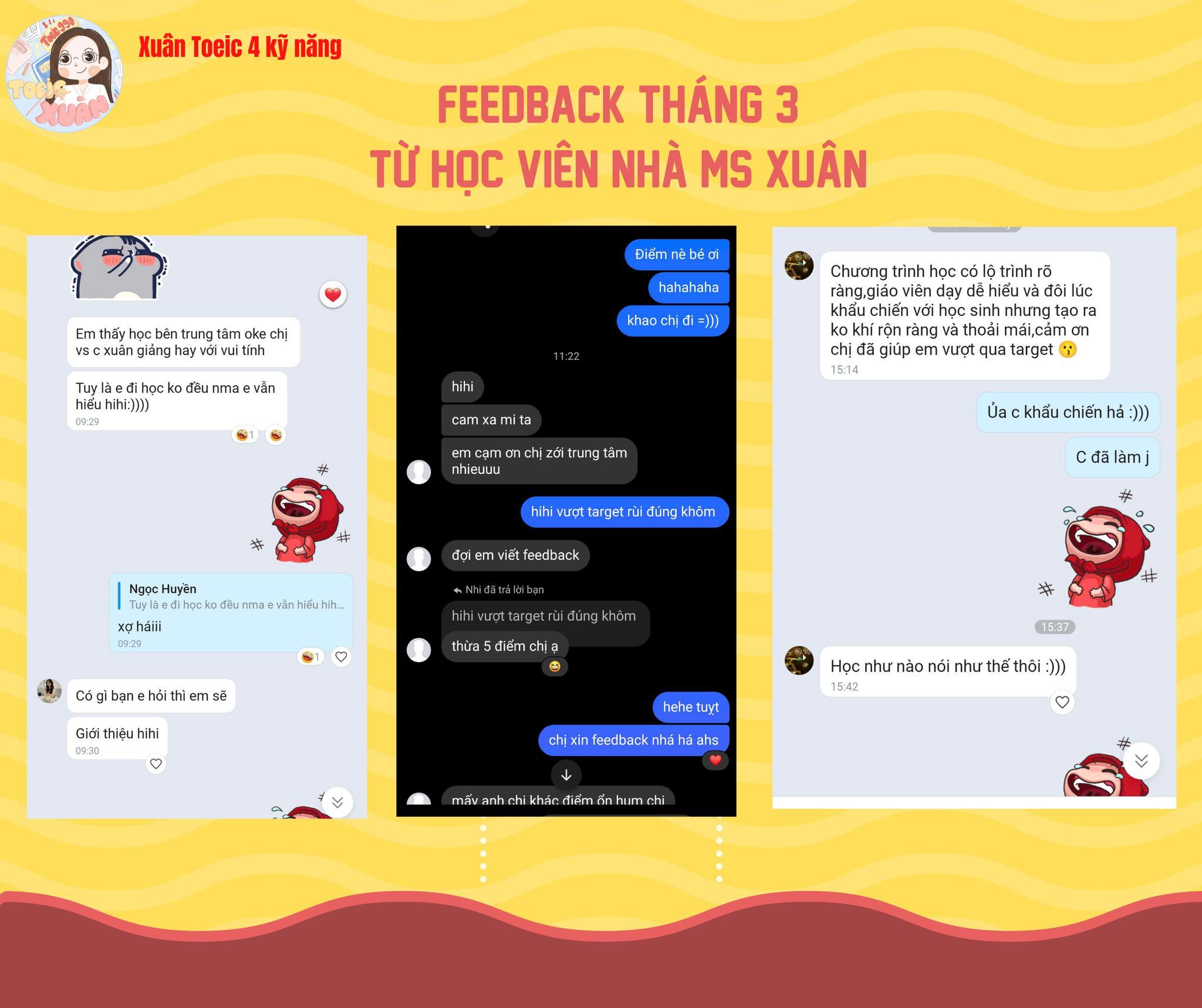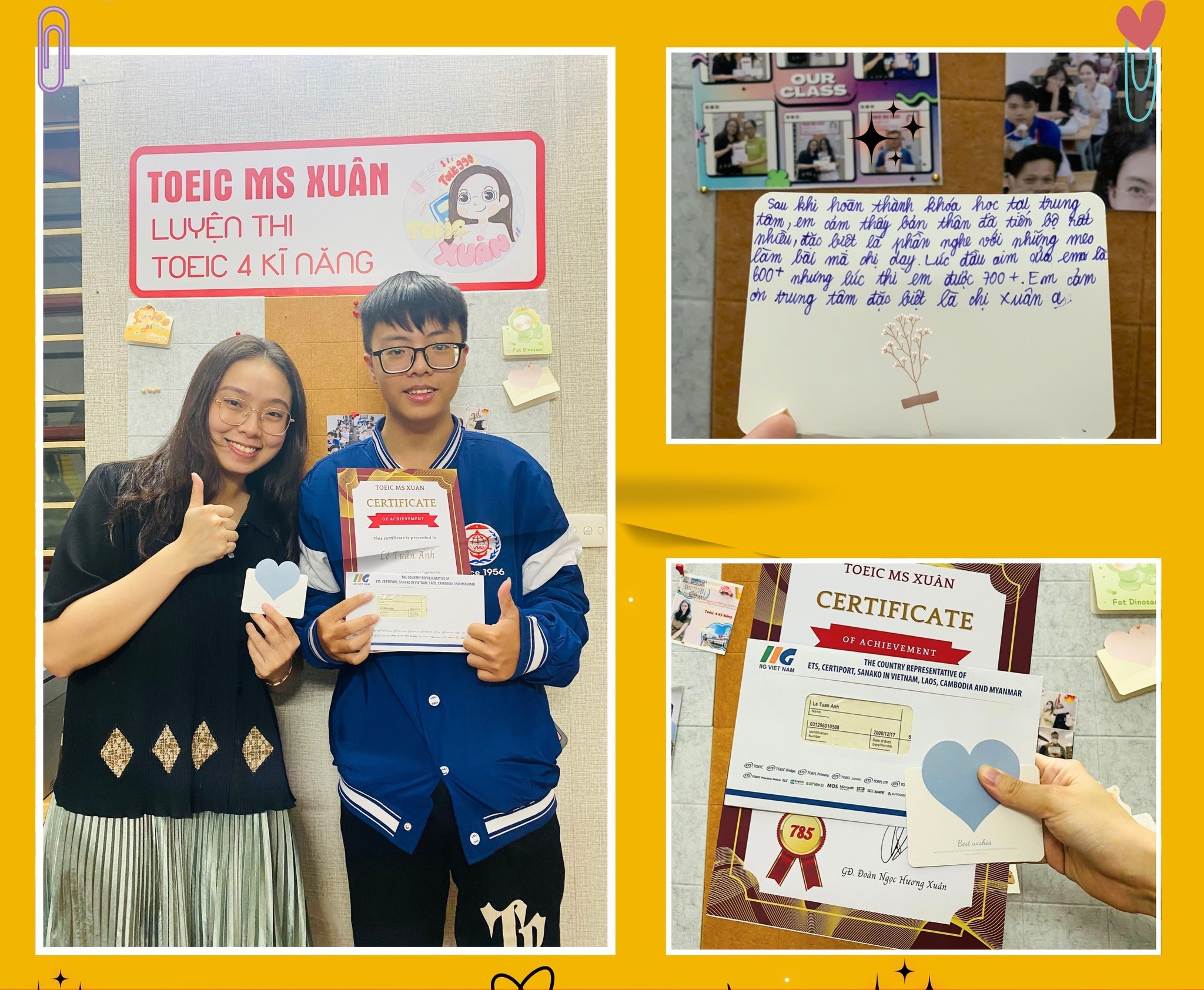 Với điểm số IELTS 7.5, TOEIC 955, chứng chỉ TESOL quốc tế, hiện đang theo học chương trình Thạc sĩ Lý luận & Phương pháp giảng dạy tiếng Anh (MTESOL) tại Đại học Canberra – Úc, cô Xuân cùng đội ngũ giảng viên của trung tâm đã không ngừng hoàn thiện chương trình học, phương pháp giảng dạy và giáo trình nội bộ riêng biệt, giúp hàng trăm học viên đạt kết quả cao trong các kỳ thi chứng chỉ quốc tế.