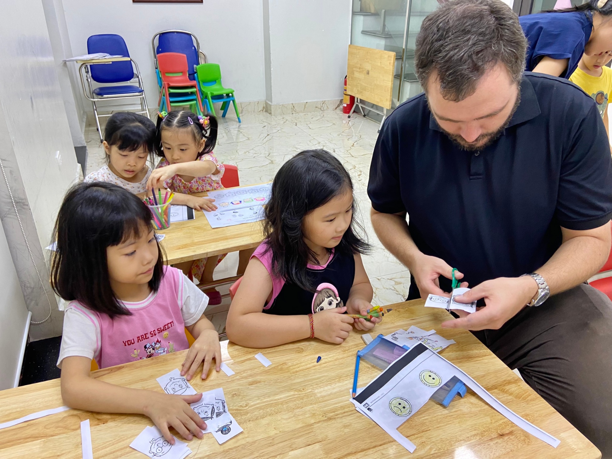 Tại Trung Tâm Ngoại Ngữ Pasal Hải Phòng, học sinh được học 100% giáo viên nước ngoài tối thiểu 3 năm kinh nghiệm, có bằng cấp chứng chỉ sư phạm đầy đủ và rất yêu quý trẻ con. Giáo viên thường xuyên được dự giờ và góp ý chất lượng giảng dạy nhằm đem đến cho học sinh trải nghiệm học tập tốt nhất. Ngoài ra trung tâm còn có đội ngũ giáo viên Việt Nam sẽ giúp các con bổ trợ ngữ pháp và nền tảng tiếng Anh trước khi nhập học.