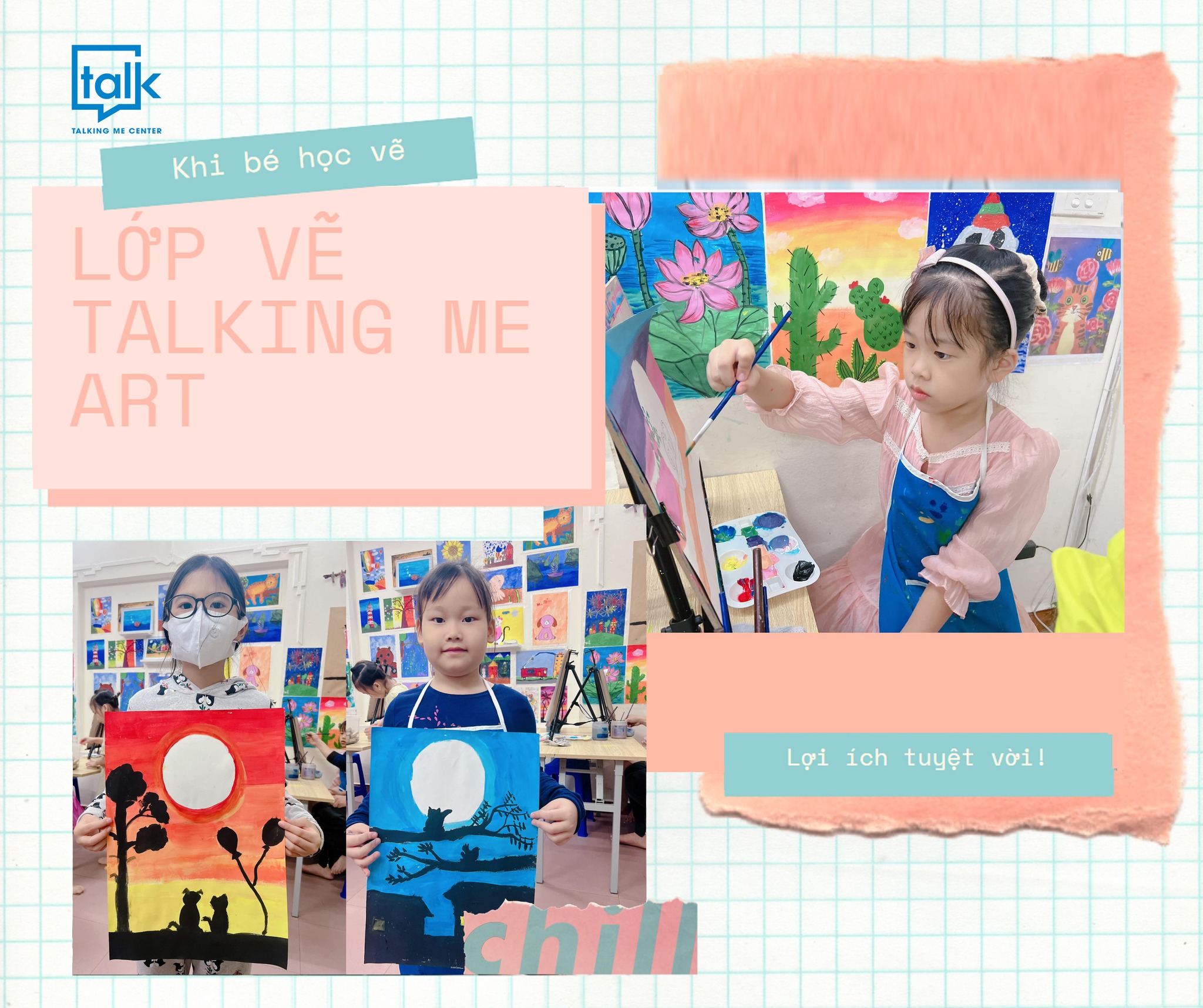 Talking Me English and Art - Với mục tiêu giúp các con được tiếp cận nghệ thuật một cách bài bản từ khi còn nhỏ. Hiện trung tâm có