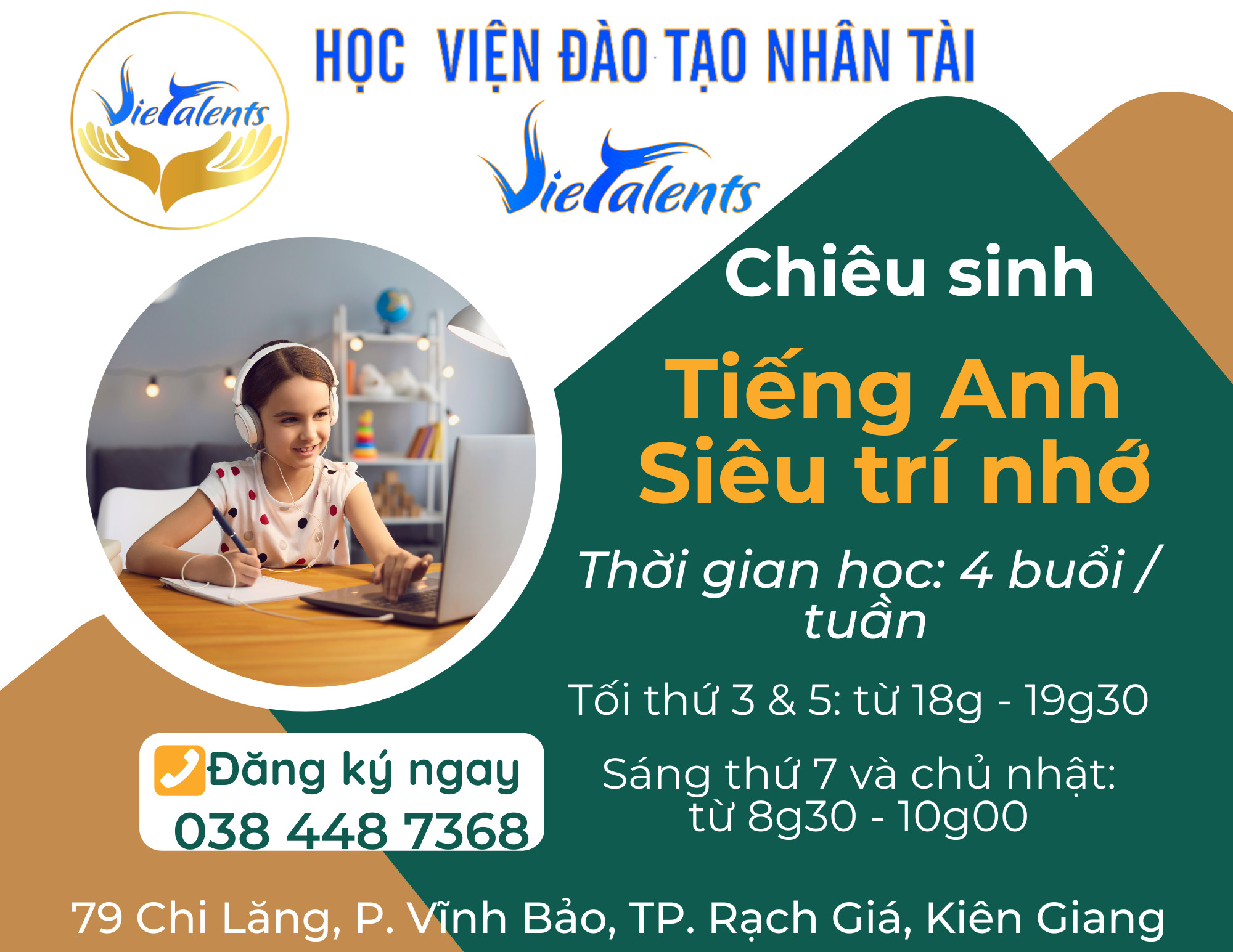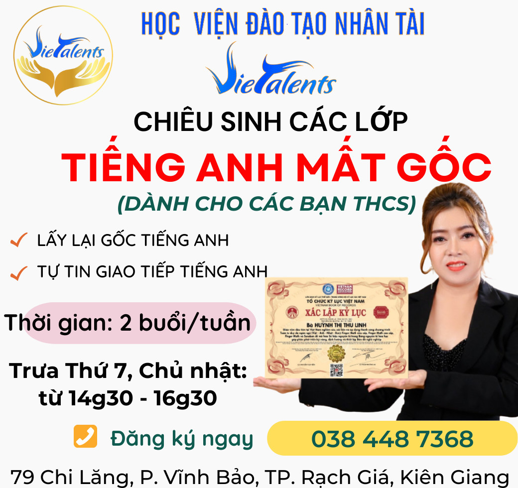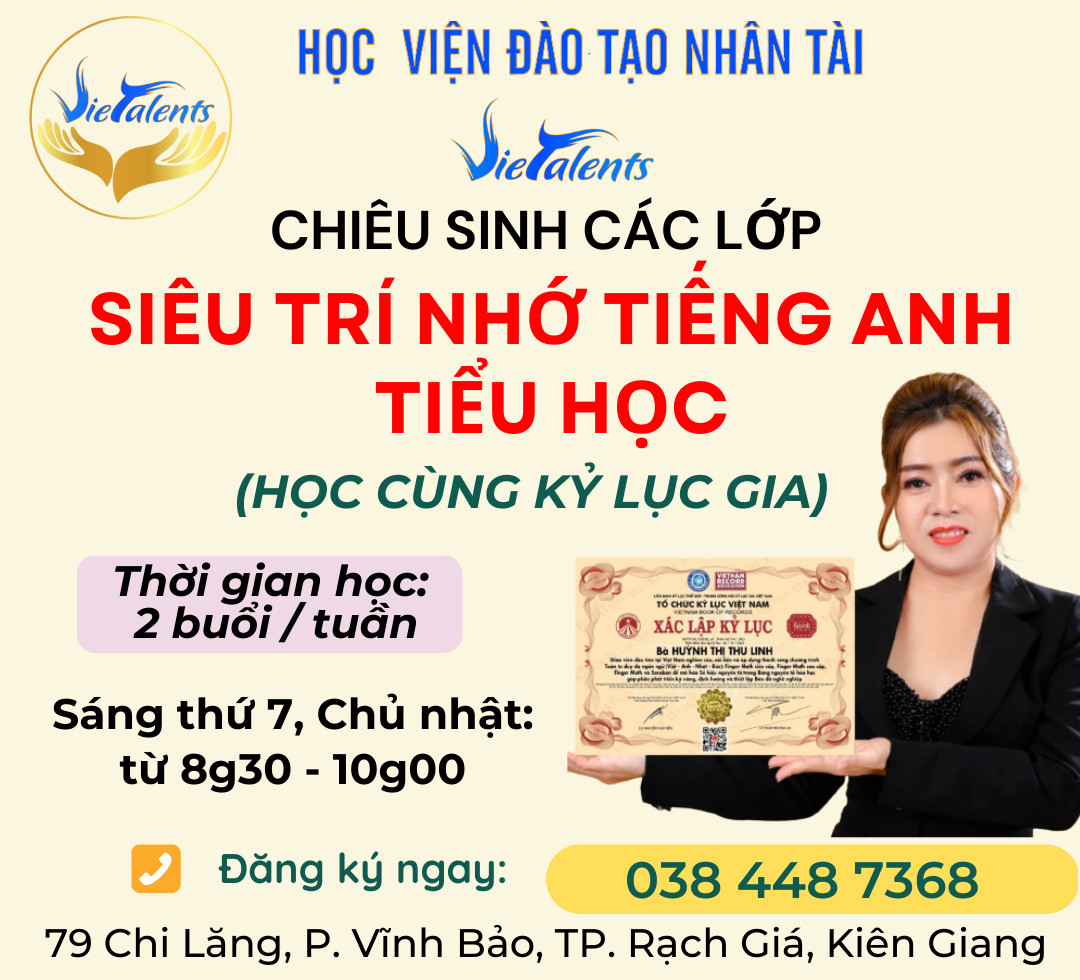 Tiêng Anh Siêu Trí Nhớ Vietalents - Rạch Giá Kiên Giang thuộc Học viện Đào Tạo Nhân Tài Vietalents - là một tổ chức chuyên đào tạo và huấn luyện trong lĩnh vực phát triển tiềm năng con người, phát huy tối đa năng lực não bộ và đánh thức tiềm năng vô hạn bên trong mỗi con người. Chúng tôi thiết kế ra chương trình giáo dục, đào tạo và huấn luyện dựa trên 3 triết lý sau: "Kỹ năng chuyên nghiệp, tư duy xuất chúng và thông thái, tâm hồn phải luôn bình an với trái tim tràn đầy yêu thương"