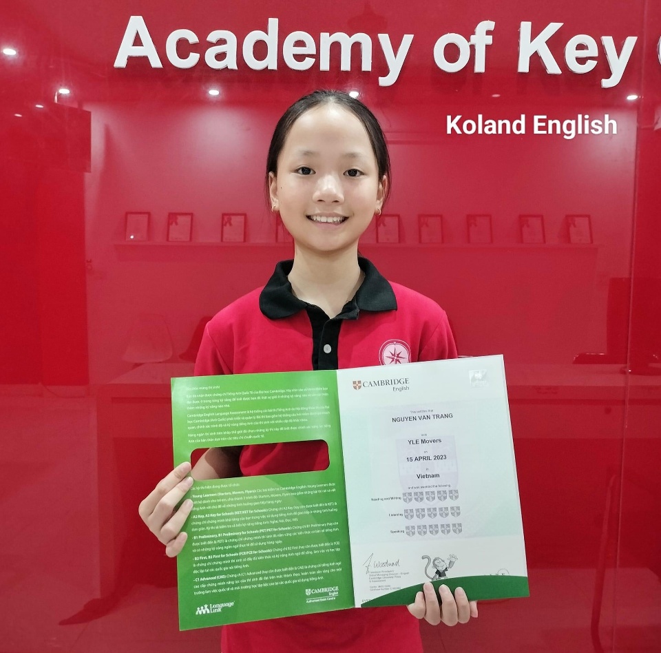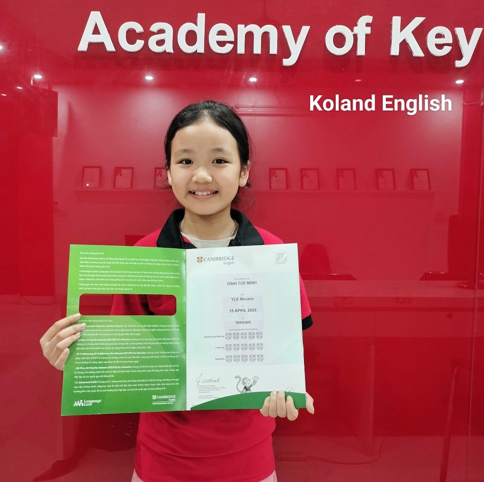 Với hơn 150 học sinh đã tham gia vào kỳ thi chứng chỉ Cambridge, Koland tự hào về thành tích ổn định, hơn 95% thí sinh đạt điểm cao trong kì thi Cambridge và 100% học sinh đạt trình độ B1 trong kỳ thi KET. Điều này là minh chứng cho chất lượng giảng dạy và sự cam kết của Koland trong việc giúp học viên đạt được mục tiêu học tập của mình một cách thành công.