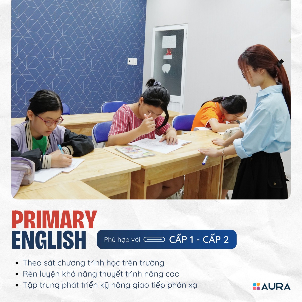 Bên cạnh đó, giáo viên tại Aura không chỉ là những người có kiến thức vững vàng, mà còn là những người đam mê nghề nghiệp, luôn sẵn lòng chia sẻ, động viên các bạn học viên cố gắng và phấn đầu trong học tập.