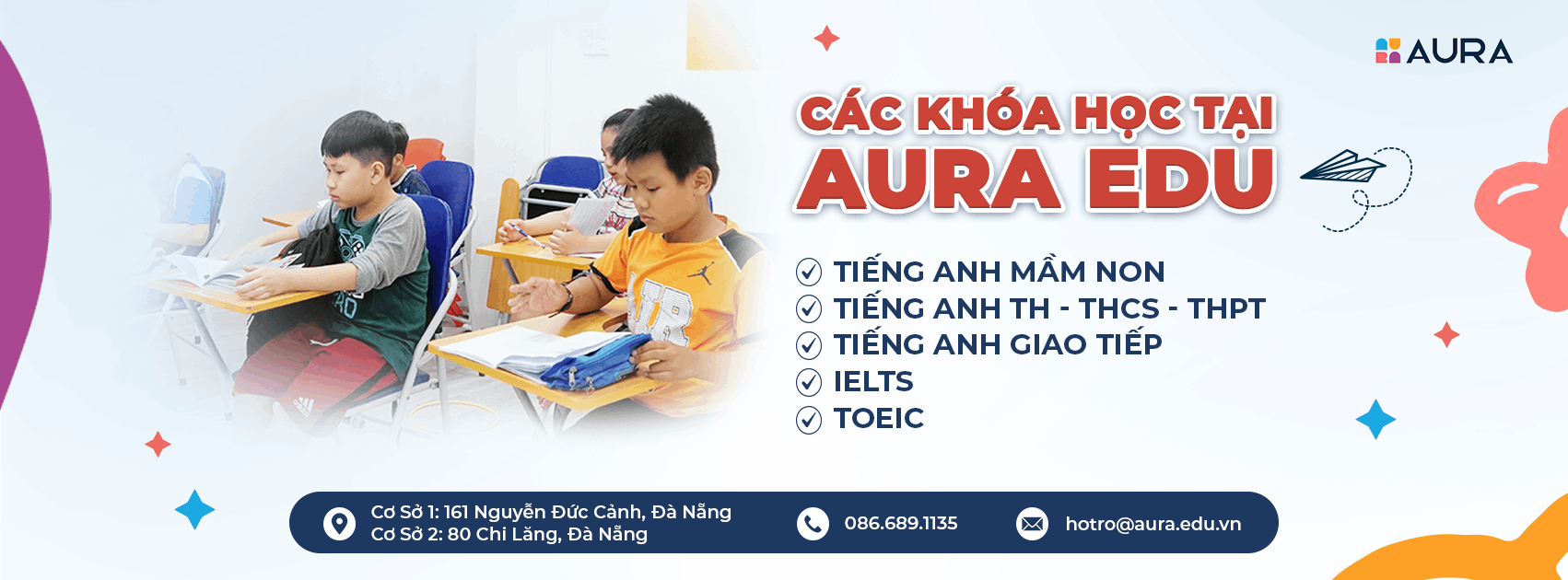 Trung Tâm Ngoại Ngữ Aura (Aura English) - Hải Châu là một điểm đến uy tín cho việc học Tiếng Anh tại thành phố Đà Nẵng. Với vị trí đắc địa ngay tại trung tâm thành phố, Aura tạo điều kiện thuận lợi về môi trường trong quá trình giảng dạy và vận hành.