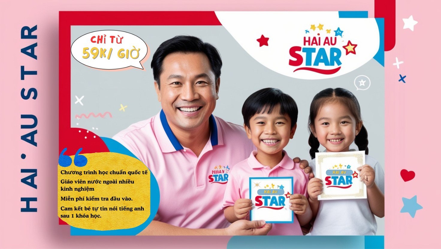 Trung tâm Ngoại Ngữ Hải Âu Star cam kết mang lại môi trường học tập chất lượng, chuyên nghiệp, giúp trẻ phát triển một cách toàn diện và chuẩn bị sẵn sàng cho những cơ hội học tập quốc tế, mang sứ mệnh cùng con bước ra thế giới - trở thành công dân toàn cầu.