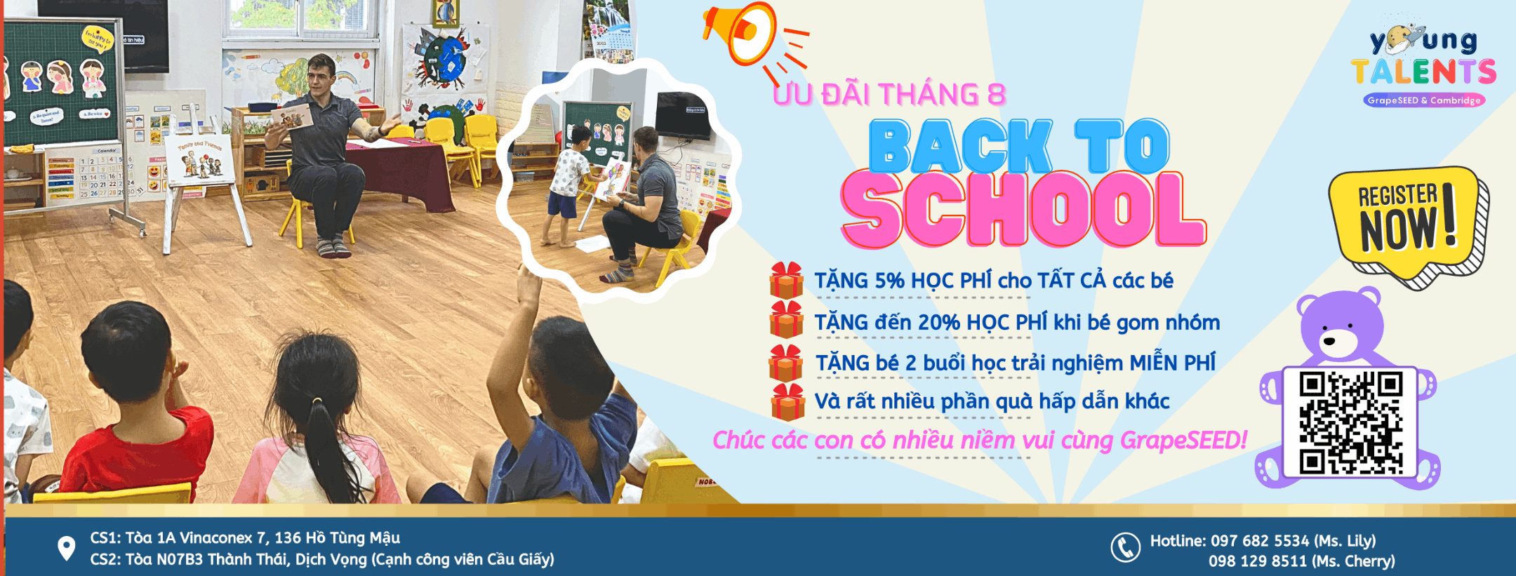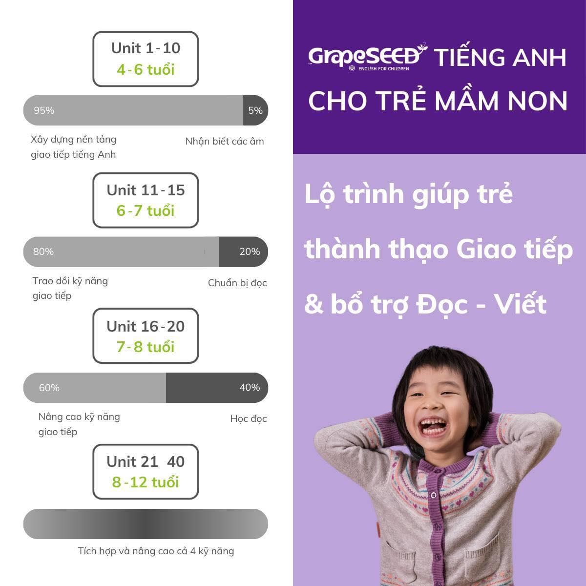 Trung tâm Ngoại Ngữ Young Talents - Dịch Vọng tự hào giới thiệu chương trình học tiếng Anh , GrapeSeeD một phương pháp giảng dạy tiếng Anh tiên tiến, chuyên sâu và vô cùng hiệu quả. Được thiết kế đặc biệt cho trẻ em từ 3 đến 12 tuổi, GrapeSeeD kết hợp các hoạt động thú vị, trò chơi sáng tạo và tài liệu học phong phú để tạo nền tảng vững chắc cho việc học tiếng Anh.