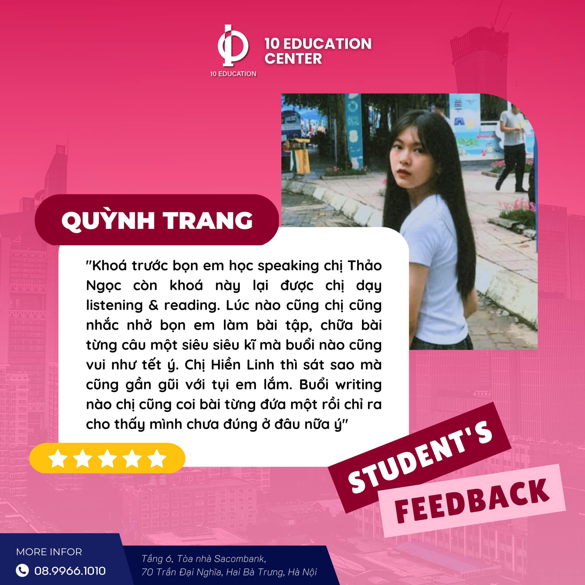 Với hệ thống các cơ sở trải khắp các thành phố Hà Nội, Sóc Sơn, Hải Dương, TP Hồ Chí Minh, 10 EDUCATION luôn không ngừng nỗ lực hơn nữa để đồng hành với hàng triệu người Việt chinh phục mục tiêu IELTS điểm cao.
