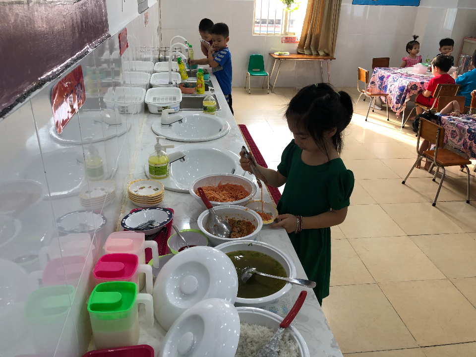 + Trẻ sẽ có 1 thế giới riêng và thể hiện khả năng tự phục vụ bản thân mình ở phòng ăn (được thể hiện vai trò người đầu bếp chế biến món ăn, được làm người nội trợ đảm đang như rửa chén, rửa ly, dọn dẹp và sắp xếp đồ dùng bếp gọn gàng).