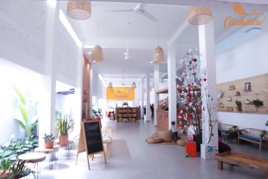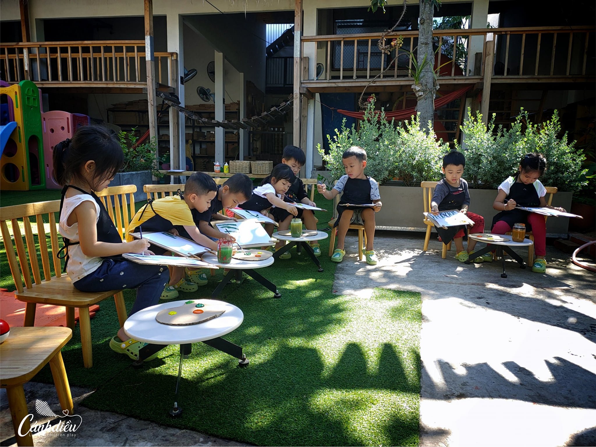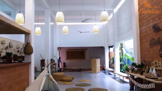 Cánh Diều Playschool tọa lạc tại một toà nhà được thiết kế chuyên biệt phục vụ cho mục đích giáo dục mầm non với lối thiết kế không gian mở bên trong nội thất nhà và sử dụng vật liệu thân thiện môi trường như gỗ, gạch với nhiều cây xanh bao bọc xung quanh tạo sự ấm cúng, thoải mái.
