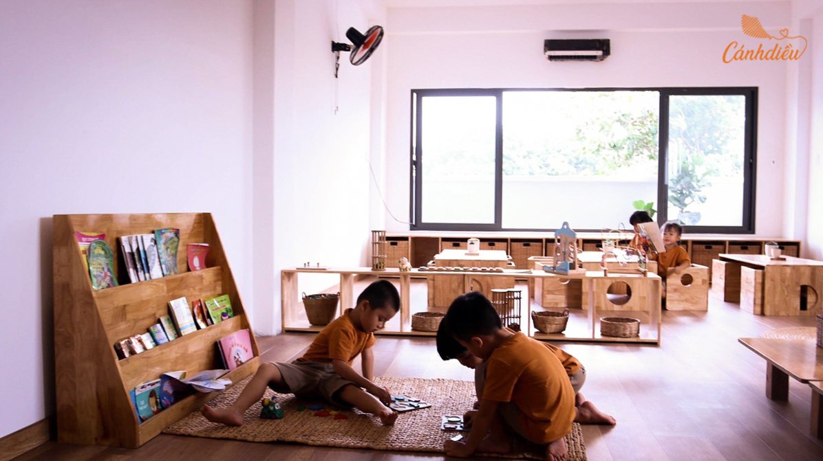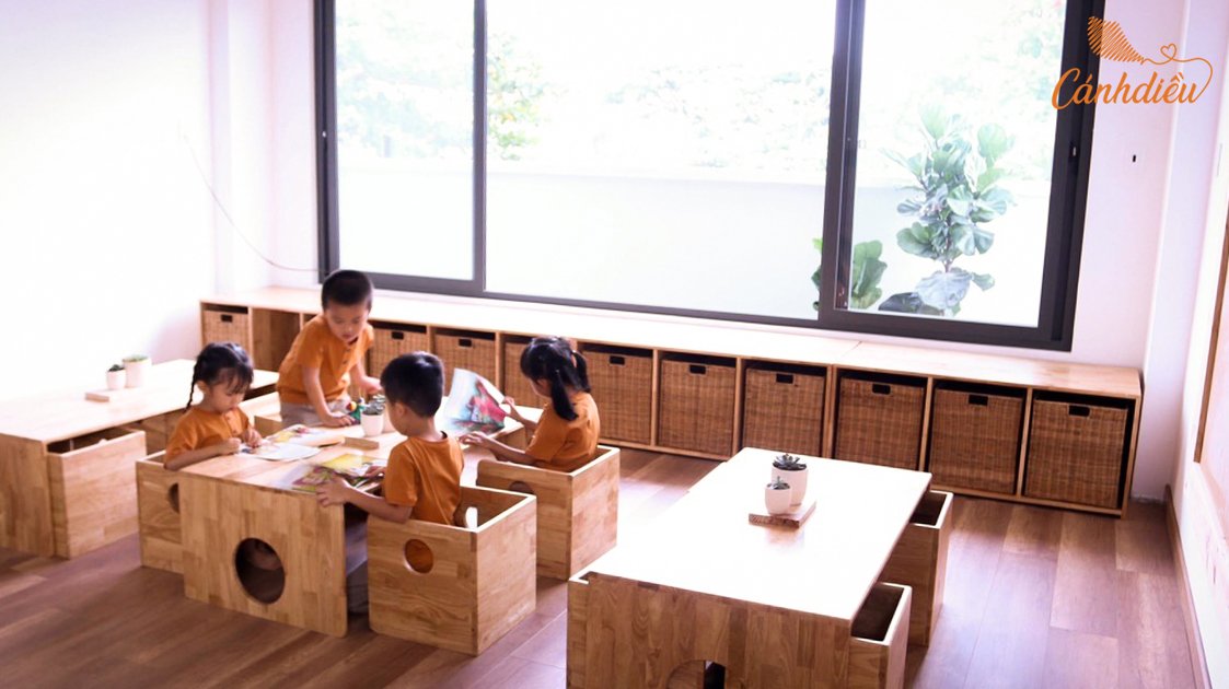 Tất cả phòng học tại Cánh Diều đều rộng rãi, sáng sủa và thoáng mát, kết nối với sảnh chung nơi bọn trẻ ăn uống và dành hàng giờ mỗi ngày để kết nối chơi đùa cùng nhau với sự vui chơi tương tác trộn nhiều lứa tuổi giúp trẻ giao lưu, học hỏi và phát triển ngôn ngữ cũng như nhận thức xã hội tốt hơn. Cửa sổ, cửa đi rộng khắp mang ánh sáng tràn vào bên trong nhà làm phông nền hoàn hảo cho đồ nội thất, góc học tập, khám phá.