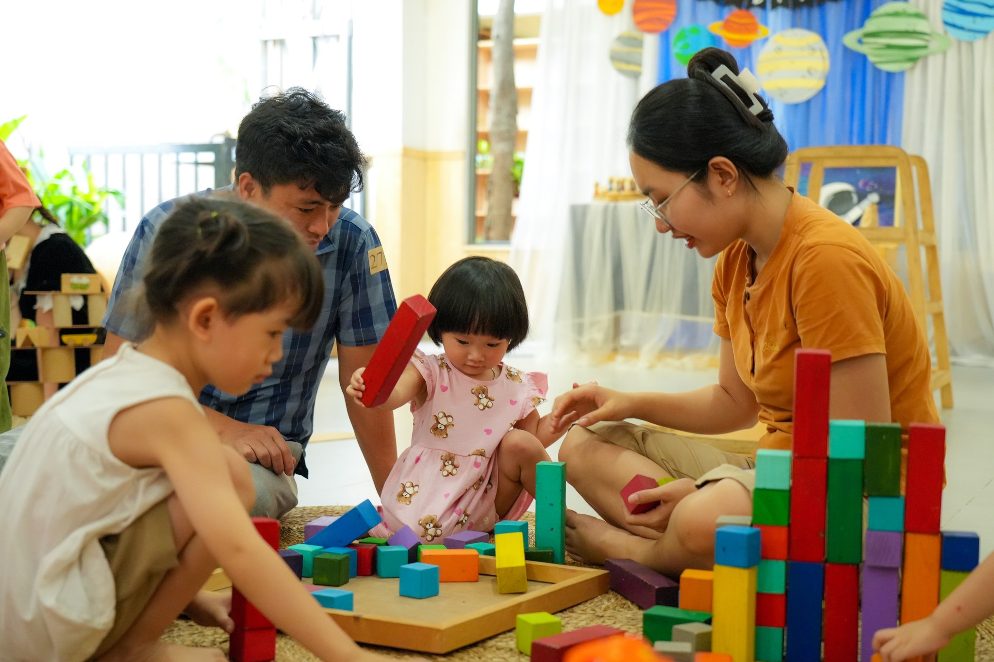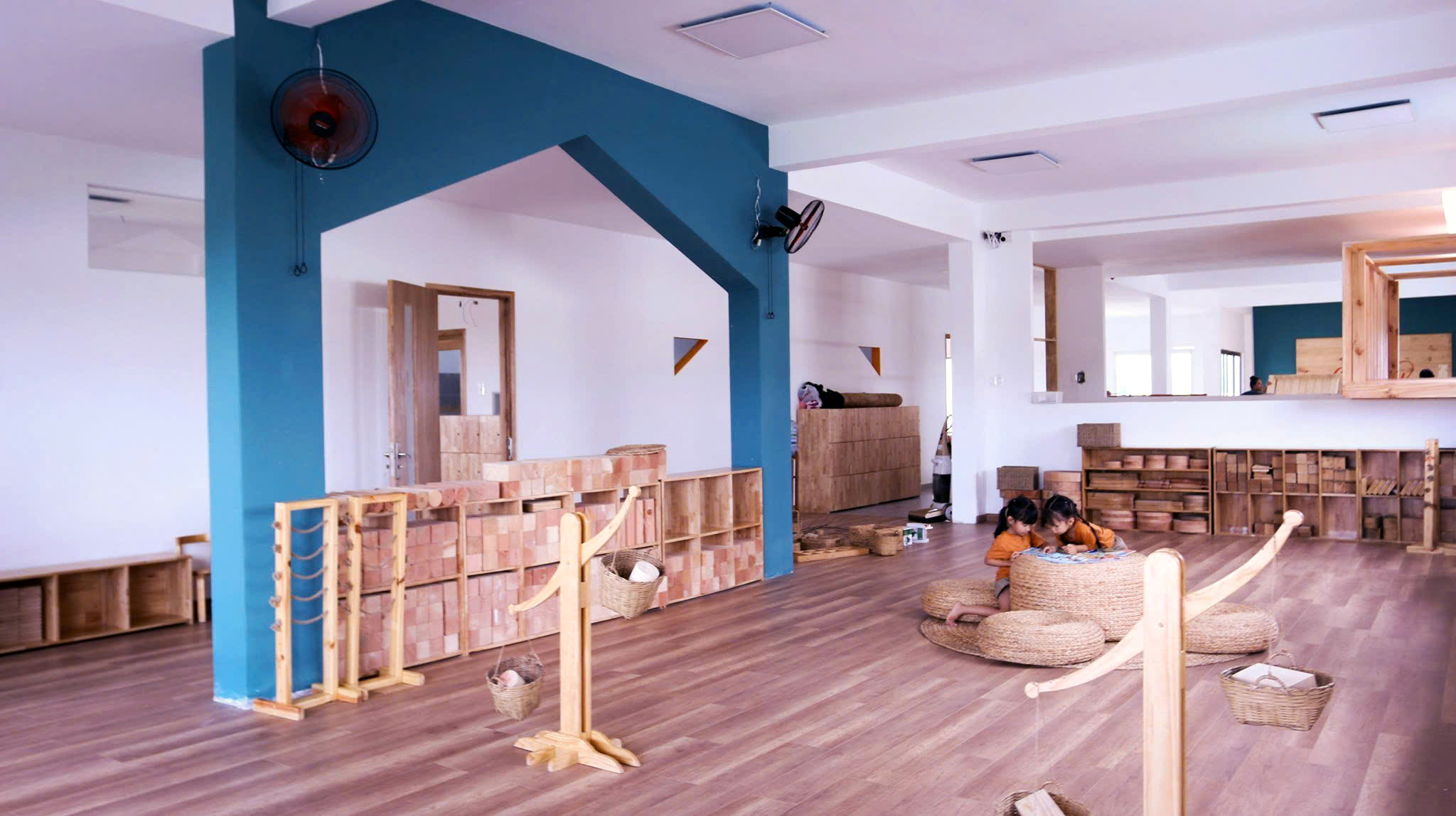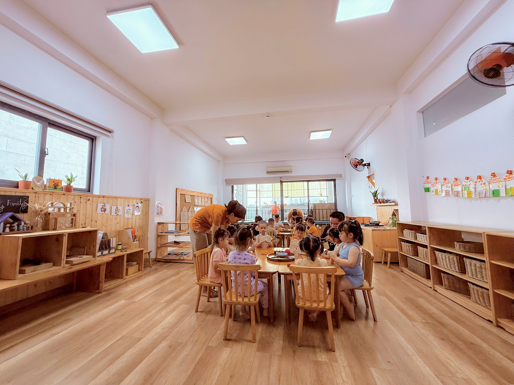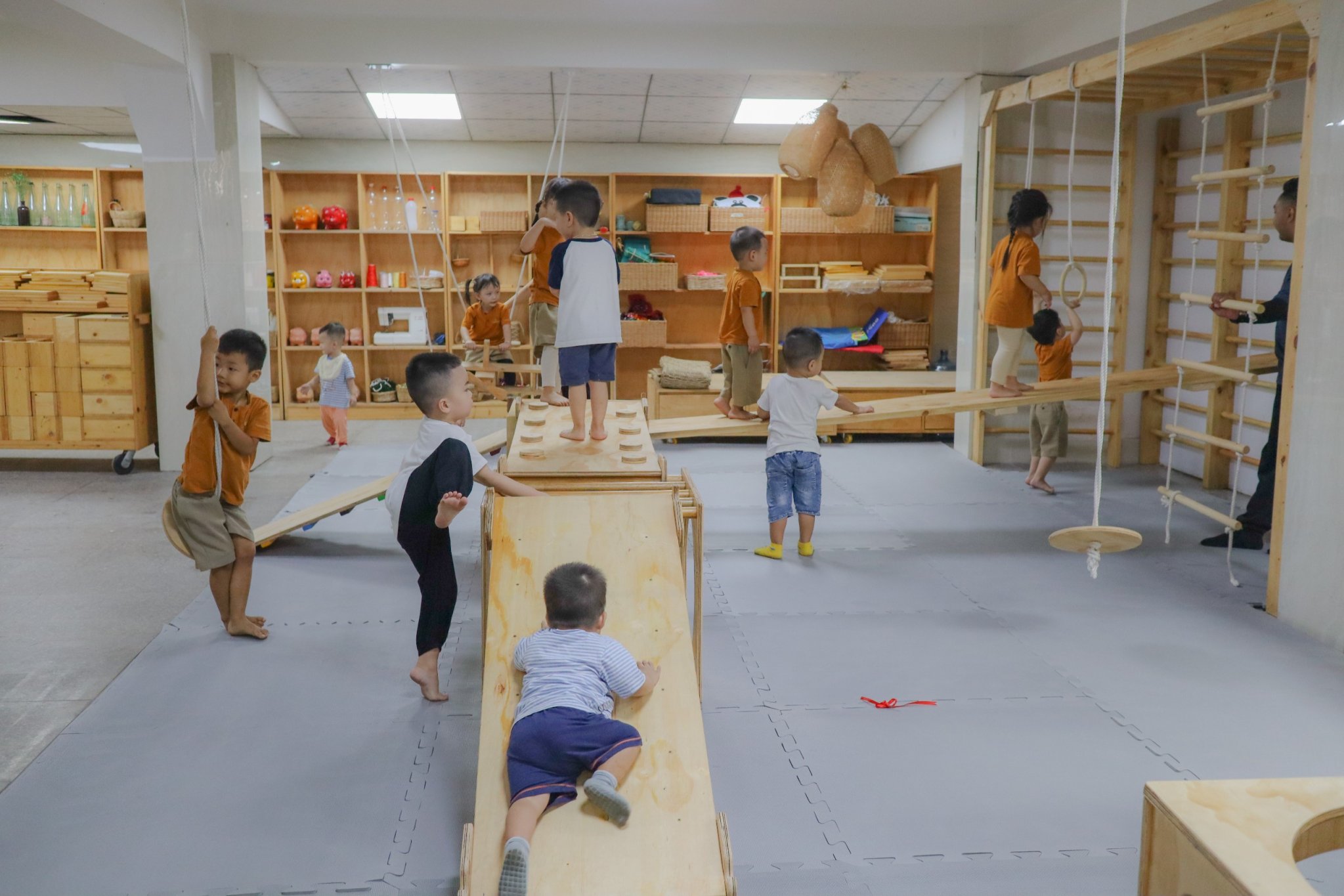Đặc biệt, hệ thống đồ chơi gỗ được module hóa giúp trẻ tự do lắp ghép, sắp đặt và thiết kế theo ý tưởng của mình, qua đó hình thành tư duy logic, khả năng quan sát và nền tảng toán học ngay từ những năm đầu đời.