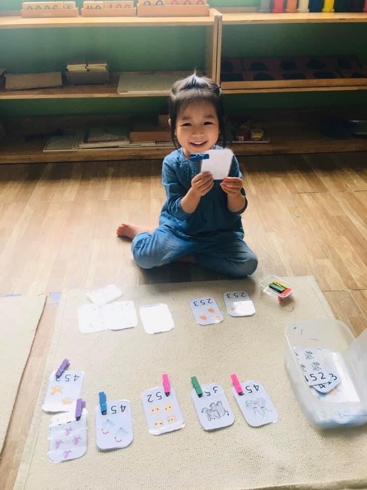 Buổi sáng bé học và chơi cùng các giáo cụ Montessori, chiều bé hoạt động theo nhóm.