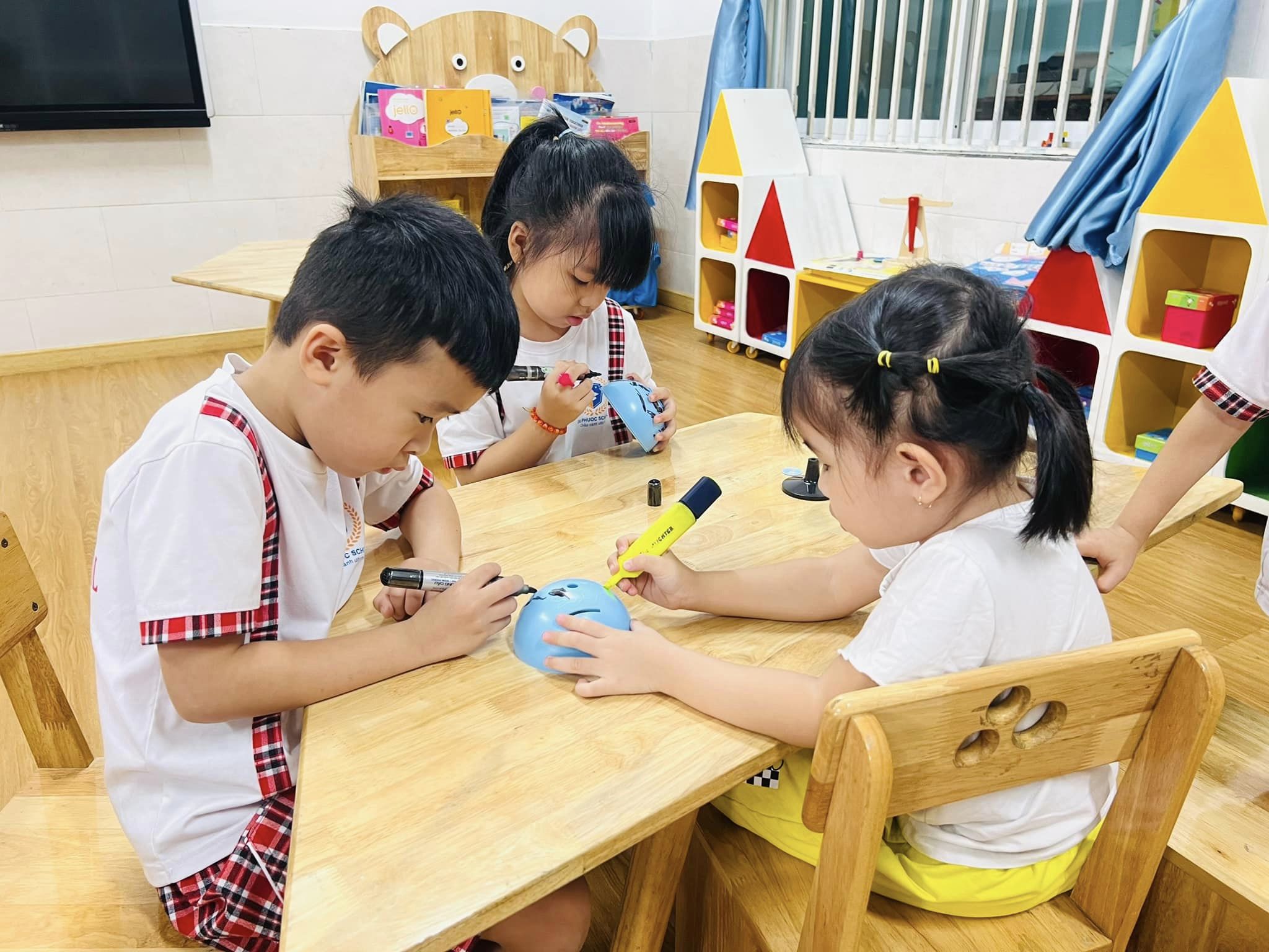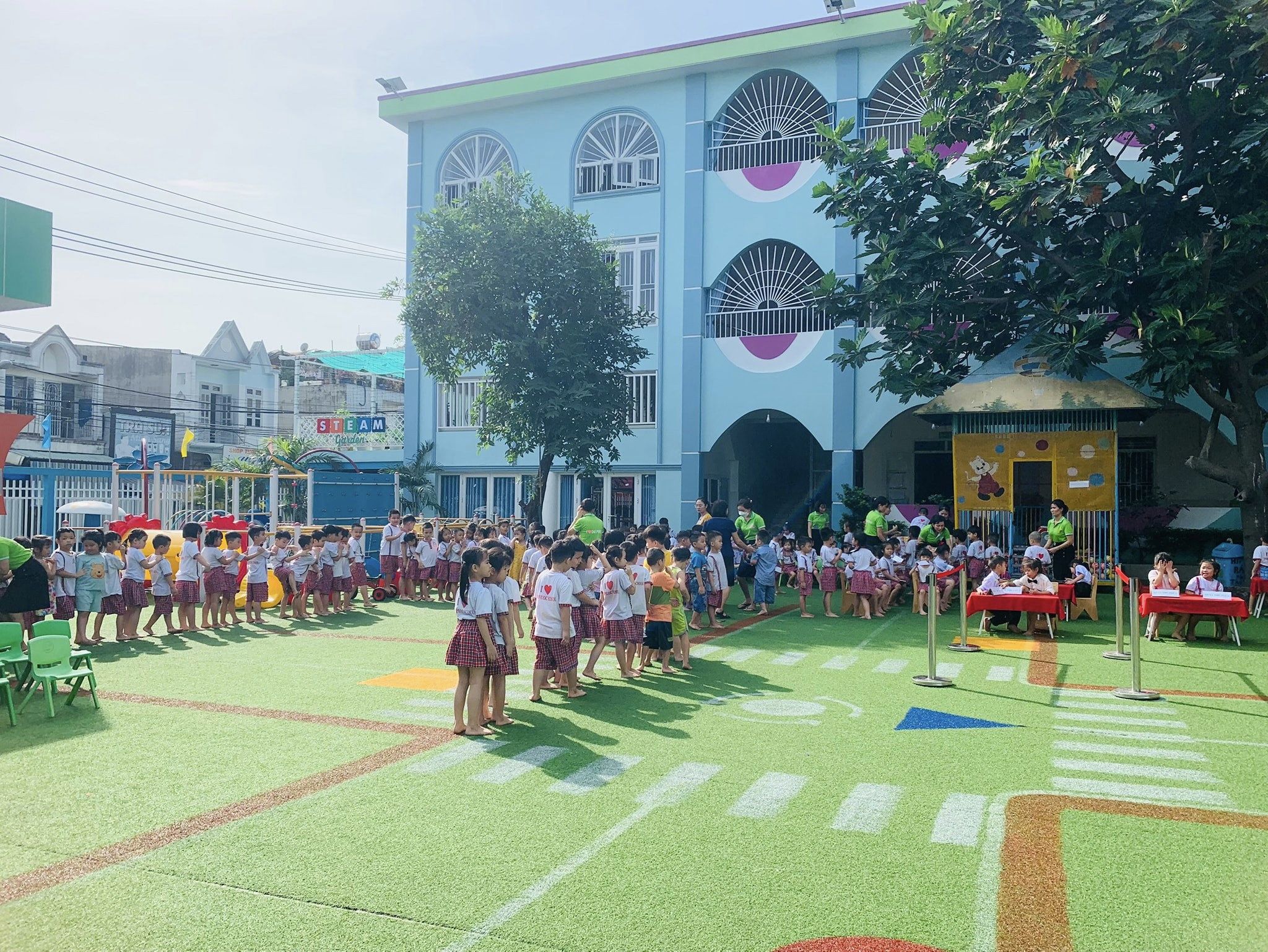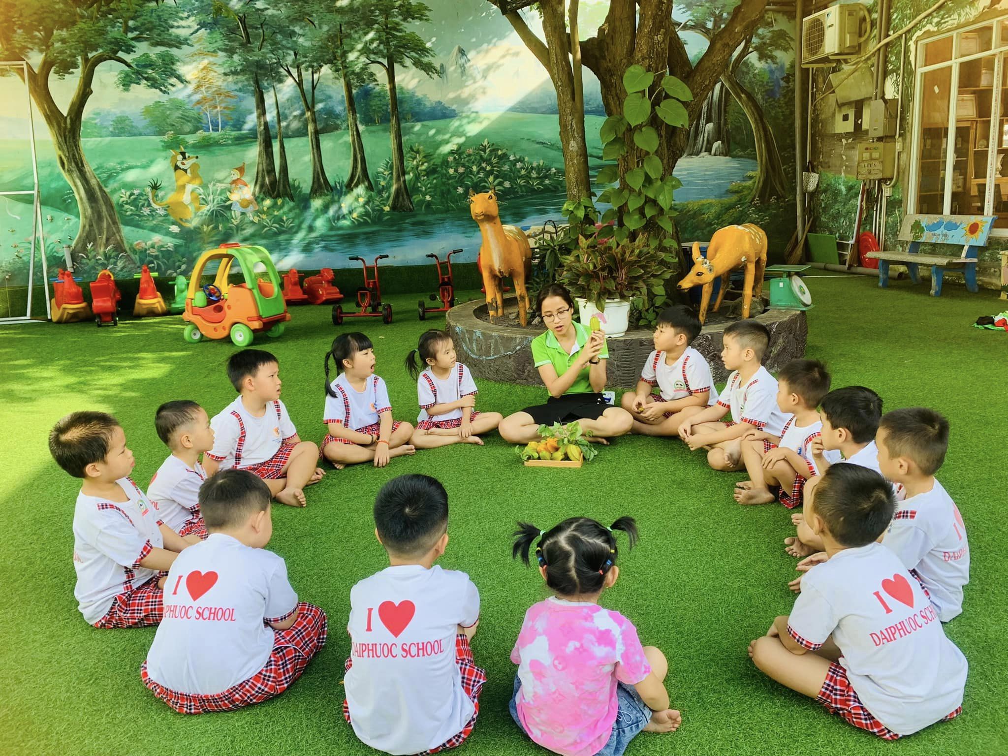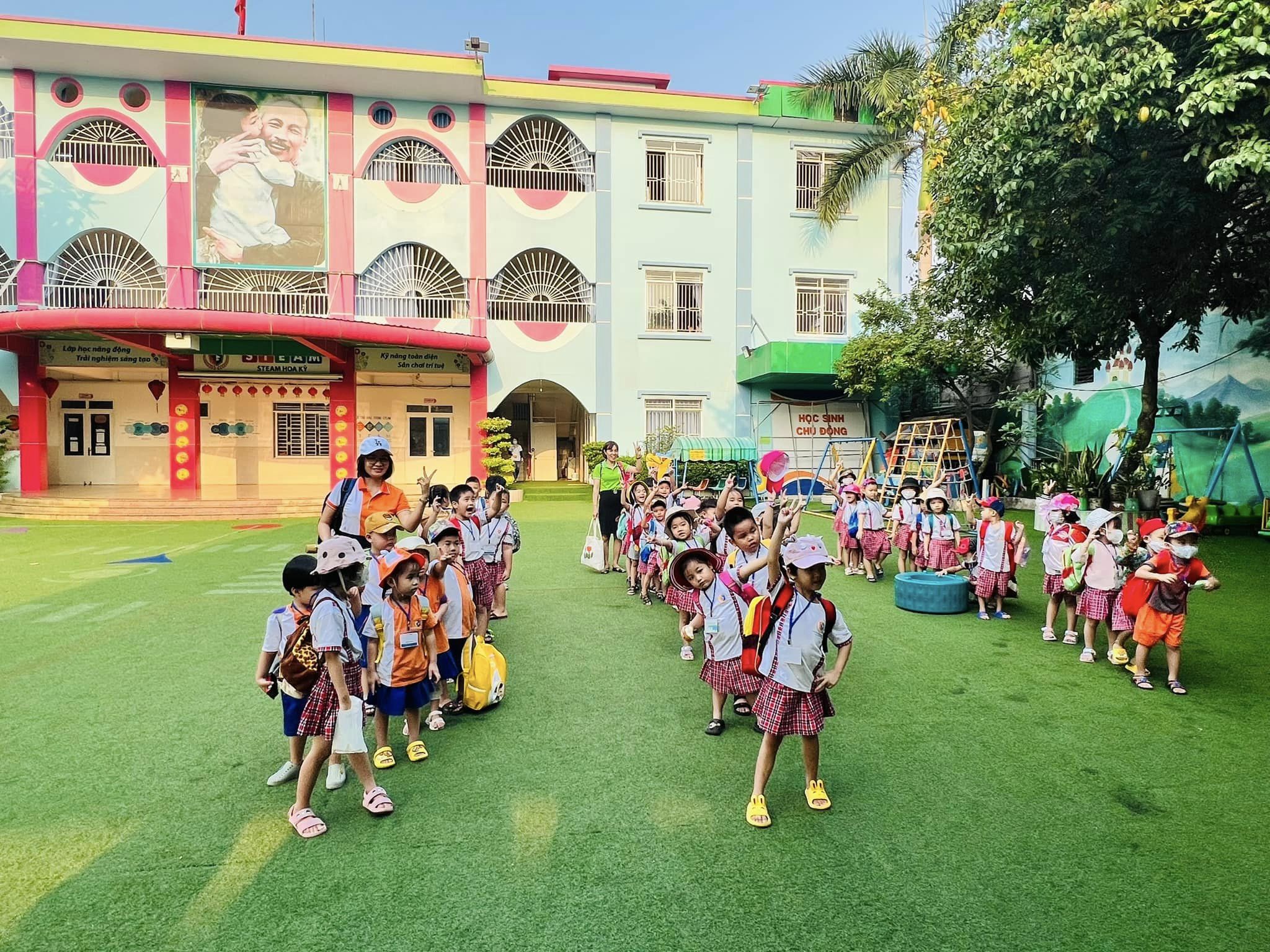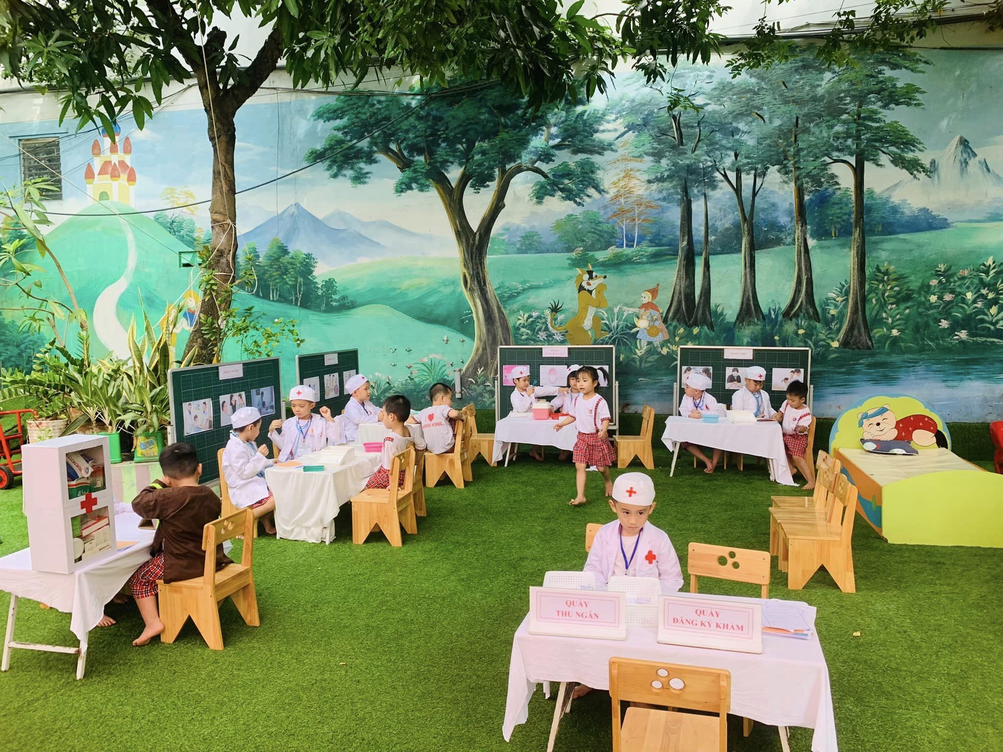 Khuôn viên rộng rãi thoáng mát, phòng học khang trang, đồ chơi đa dạng , phong phú . Sân chơi được đầu tư bài bản tạo cảnh quan hấp dẫn luôn đảm bảo yếu tố : Sáng, Xanh, Sạch, Đẹp. Trẻ đến trường được hoạt động kết nối với thiên nhiên phát triển toàn diện về mọi mặt.