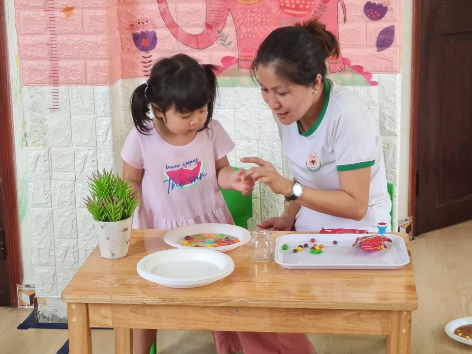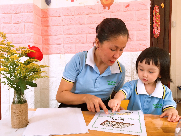 Các con được tiếp xúc Tiếng anh hàng ngày với giáo viên bản ngữ, cô vừa dạy học và chăm sóc các con, giúp con có cơ hội tiếp xúc tiếng Anh từ nhỏ.
