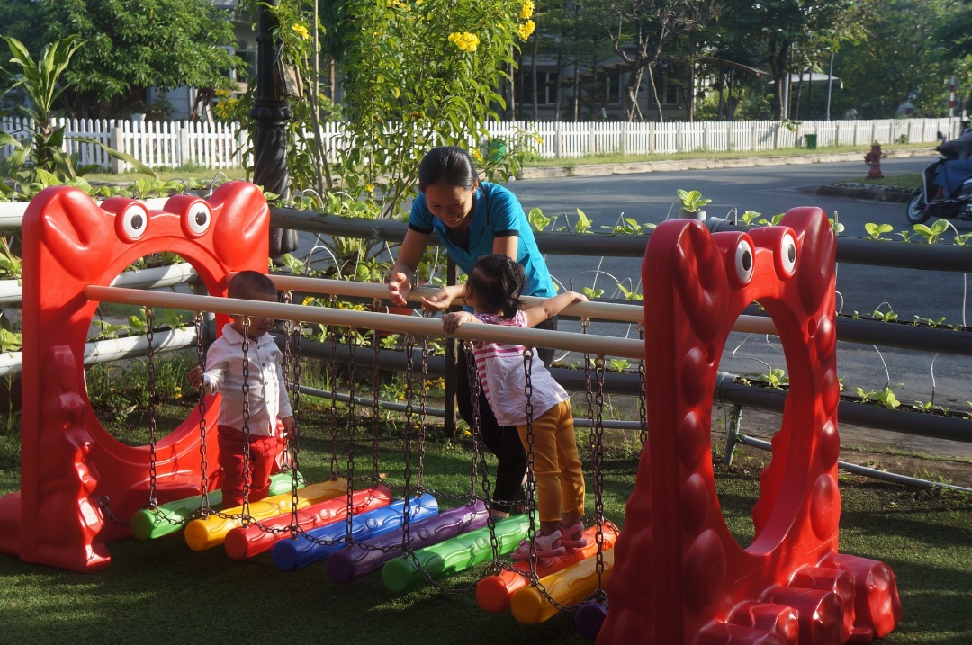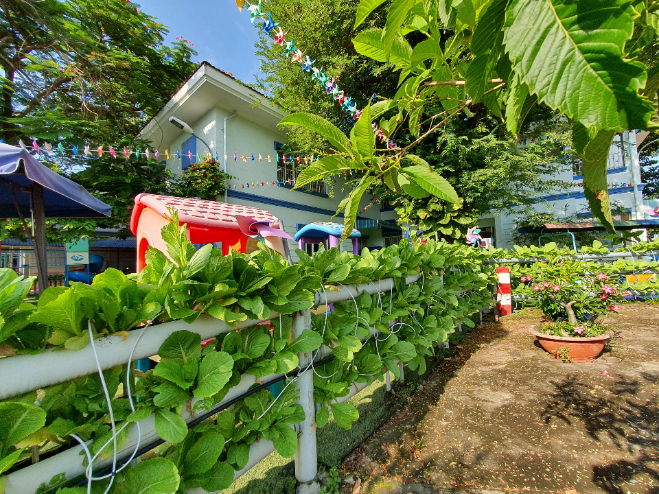 Khuôn viên trường còn có vườn rau xanh mướt, cho bé các hoạt động trải nghiệm thu hoạch rau thú vị và bổ ích.