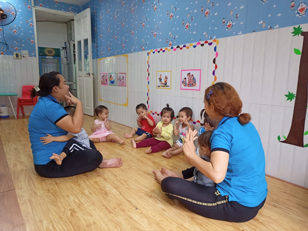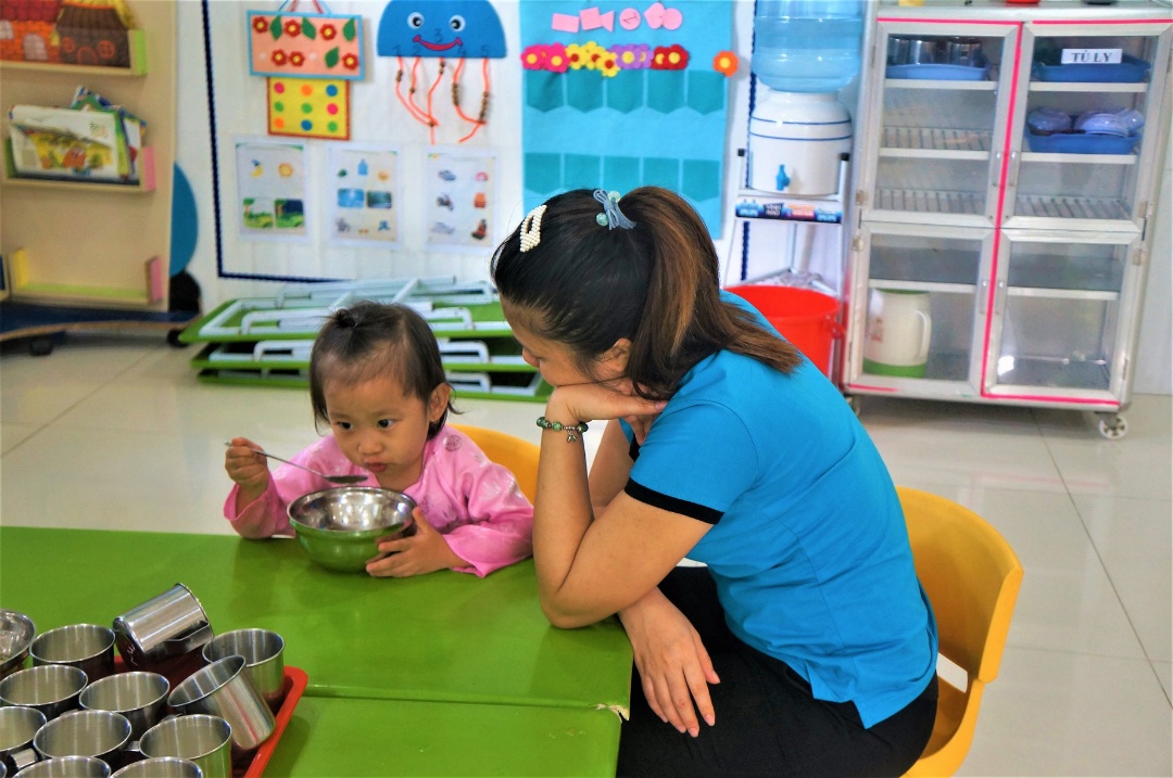Cô giáo chăm bé theo tôn chỉ của trường "Gia tài của con là tình yêu thương", dù ở nhà hay ở trường thì các thiên thần nhỏ sẽ luôn được sống trong không khí gia đình ấm áp nhờ sự tận tâm và chu đáo của các cô.