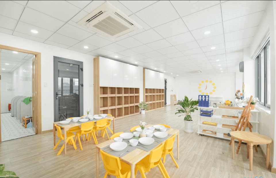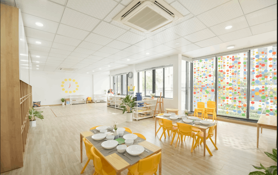 KHÔNG GIAN LỚP HỌC: Lớp học được trang bị đầy đủ ánh sáng tự nhiên, cửa sổ thông thoáng mát. Thời gian sinh hoạt ngoài trời hàng ngày, lớp học ngoại khóa và sân chơi trong nhà cho những tiết học làm quen với nước. Giúp con luôn có cảm giác đổi mới và kích thích sáng tạo tò mò khám phá trong con.