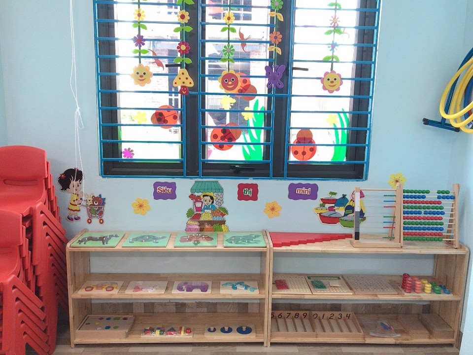 Các con tại trường mầm non Sao Mai học theo chương trình của Bộ Giáo Dục đề ra, ứng dụng phương pháp Montessori: góc thực hành cuộc sống, góc phát triển 5 giác quan, góc Toán học.
