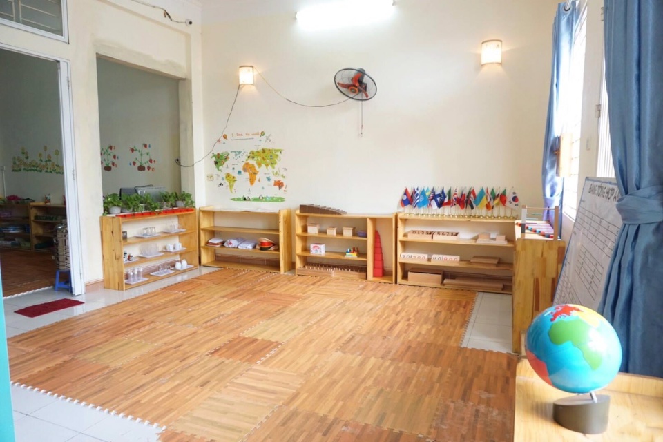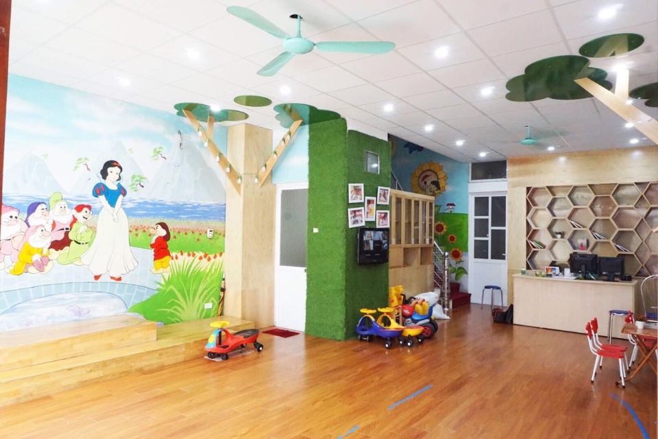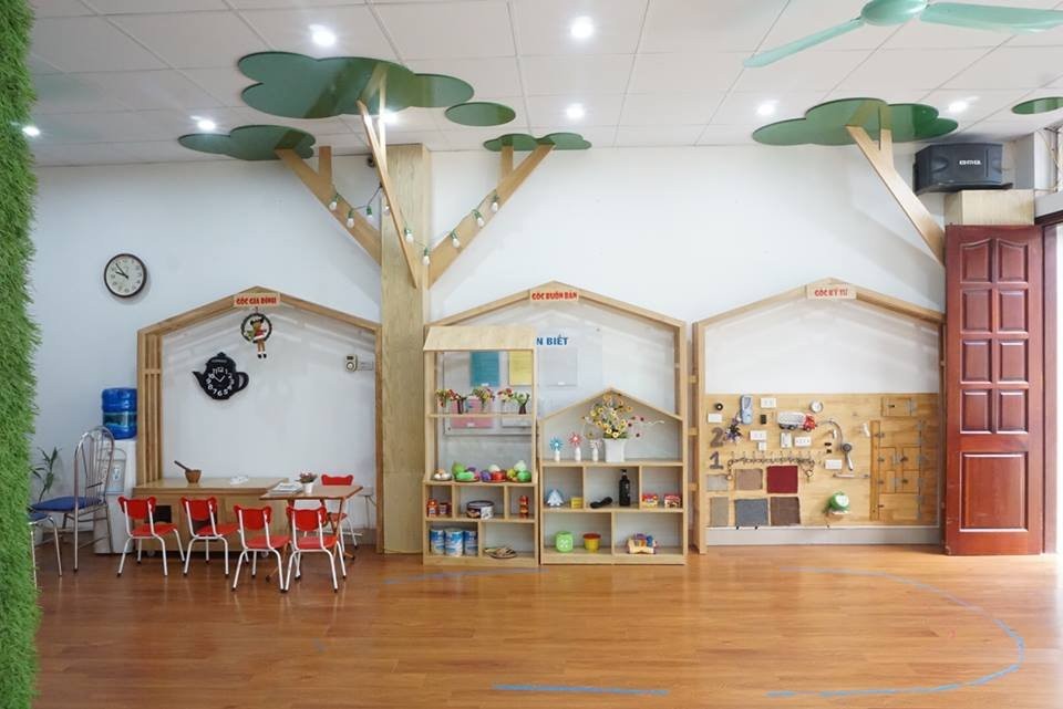 Cơ sở vật chất hiện đại, tiện nghi với sân chơi trong nhà, phòng học diện tích lên tới 80m với đầy đủ giáo cụ học tập cho bé.