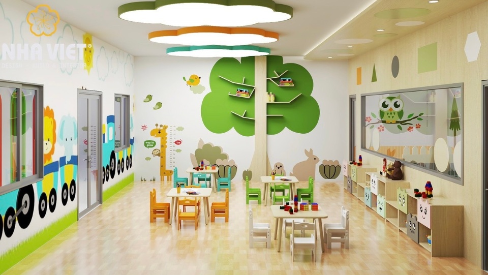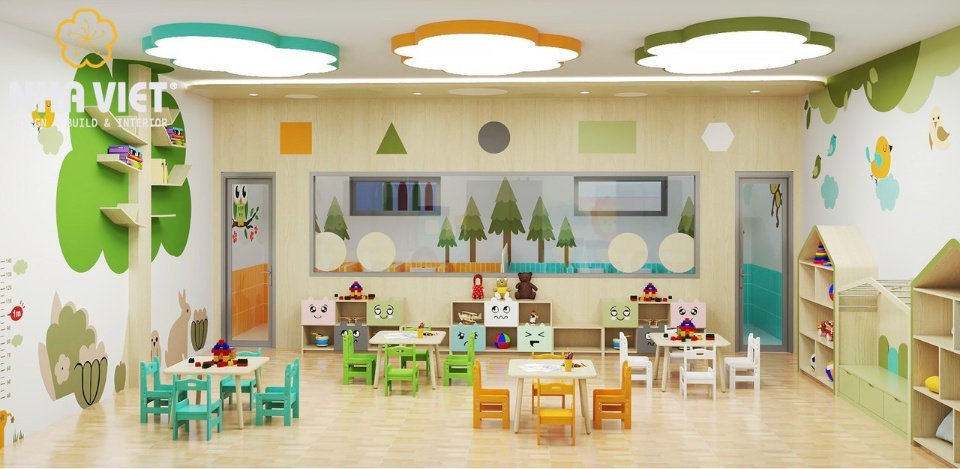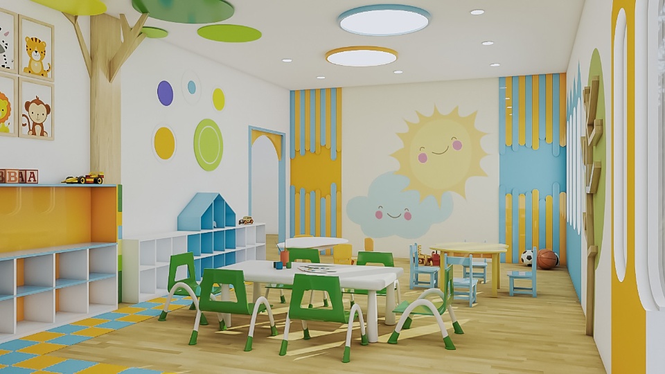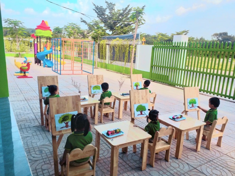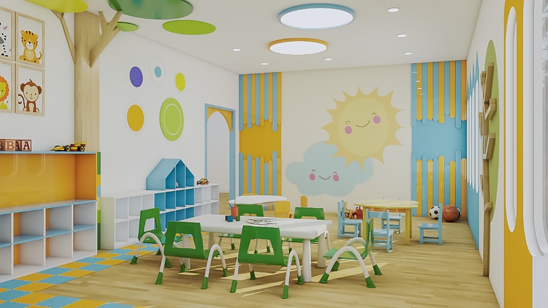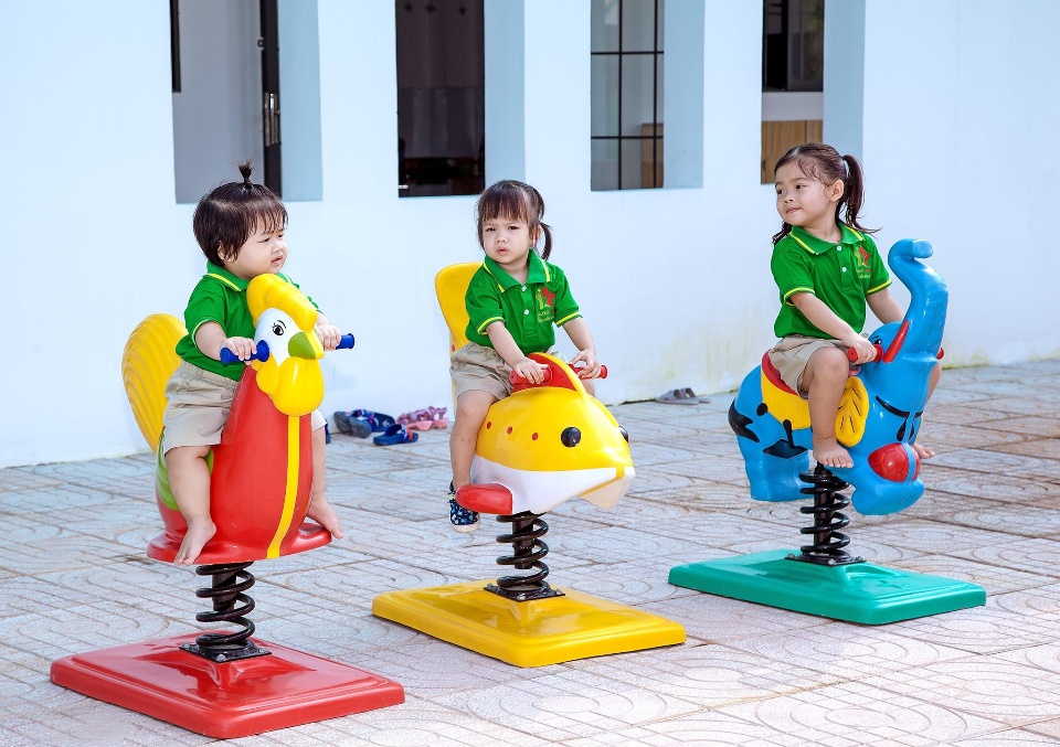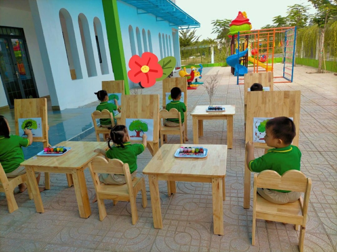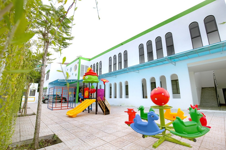 • Khuôn viên nhà trường rộng rãi giúp trẻ thoải mái hơn khi vận động . Được khử khuẩn thường xuyên bảo đảm sức khỏe cho trẻ