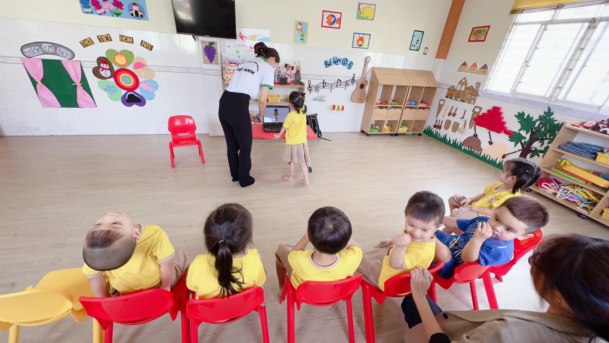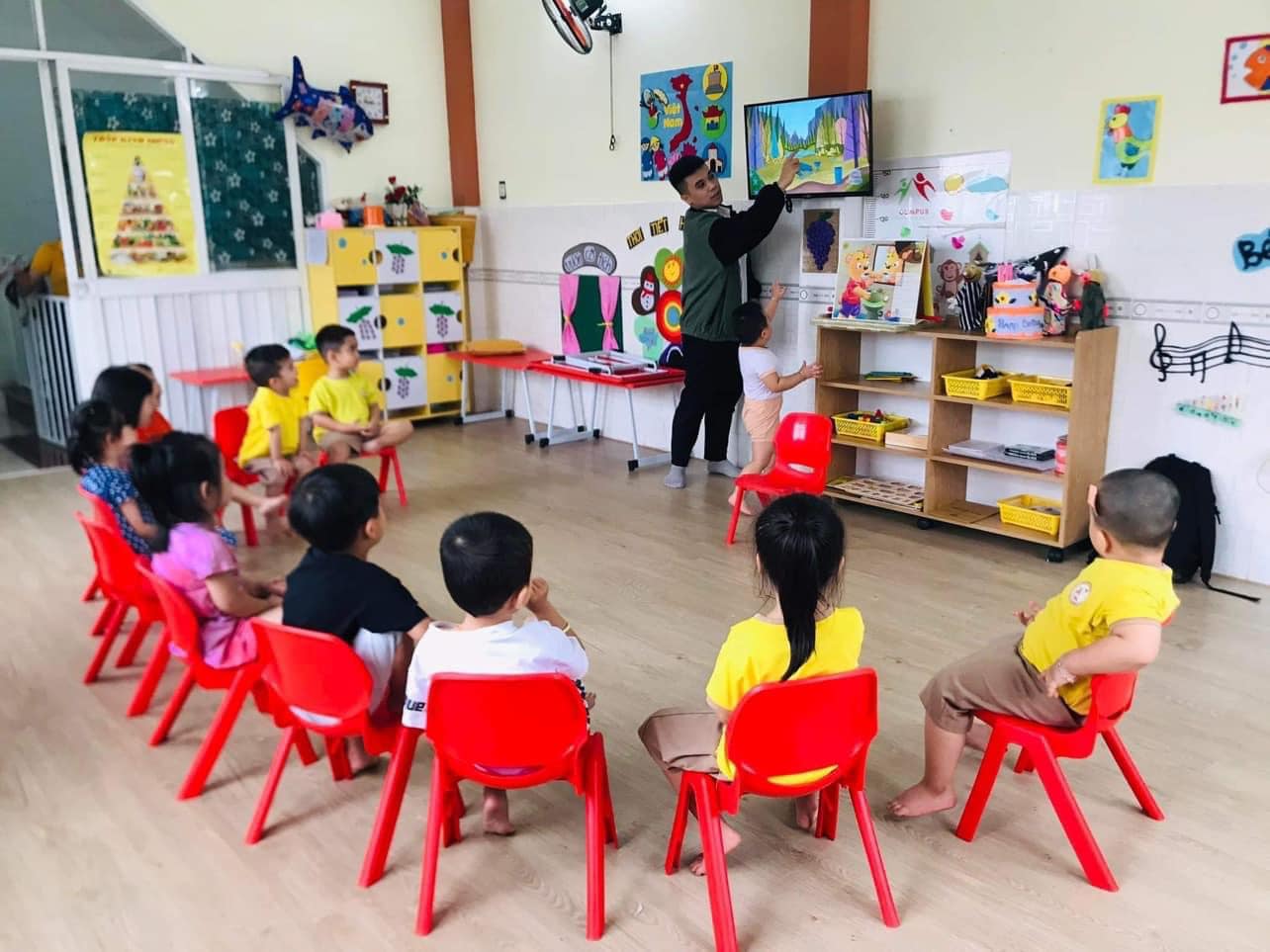 Lớp học chỉ từ 10-15 bé gồm 1 giáo viên chính và 1 bạn trợ giảng hỗ trợ trong việc giảng dạy.